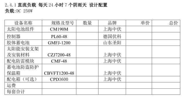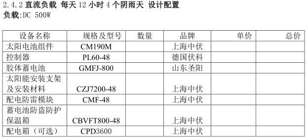 1 、系统说明 1.1 系统工作原理 白天,太阳能电池板在太阳光照射下产生光伏电流,在控制器的控制下为蓄电池充电, 同时为用电设备提供电源。若阳光资源不好,则蓄电池在控制器的控制下,将储存的电量放出,为用电设备提供电源。当太阳光照条件满足充电要求时,控制器控制太阳电池组件开始新一轮的充电。由于蓄电池具有象水库蓄水一样的功能,它在有阳光时储存的电量会逐渐累积,当遇到阴雨天或夜晚不能为蓄电池充电时,蓄电池平时储存的电量可供系统继续工作, 依然可稳定提供电源。 当遇到长期连续阴雨天,太阳能发电量不足,蓄电池电压持续下降,到了设定值,系统 关闭负载输出功能,保护蓄电池。当蓄电池电压升到设定值,系统自动恢复供电。 1.2 太阳能供电系统的优势 绿色环保、无污染、无废弃物; 晶体硅太阳能电池使用寿命长达 25-35 年; 一次性投资,长远受益,实际使用成本经济合算; 不用挖沟布线,就地施工,节省工程时间及费用 运行稳定,高效节能,MTBF(平均无故障时间)长; 使用免维护,可实现无人值守; 不受地理环境影响,适用于国内 95%以上地区; 安装使用简便,可因地制宜施工,易于拆迁及扩容; 直流低压电,线路损耗小,与 220V 交流高压电相比,不易引发雷击,无长距 离线路传输上的弊端; 2 、系统设计 2.1 系统设计概述 2.2 气象数据 本项目位于安徽省淮南市。当地的自然条件数据,见下表(取自美国航空航天总局 NASA 网站)。 太阳能供电系统的设计须考虑以下因素:安装使用地的太阳能辐射情况、负载用电情况、 系统可靠性、系统无光照自维持时间等。我公司根据国际设计理论及多年的设计经验,开发出太阳能供电系统计算机辅助设计系统,经多年实践验证,系统设计准确、安全、 可靠。 2.3 设计依据及标准 1 、独立光伏系统的设计符合以下标准 GB/T953-1998《地面用晶体硅光伏组件设计鉴定和定型》(eqv IEC 61215) GB/T18479-2001《地面用光伏(PV)发电系统 概述和导则》 GB/T19064-2003《家用太阳能光伏电源系统技术条件和试验方法》 ZBK84001.1-88《储能用铅酸蓄电池技术要求和试验方法》 2 、系统设计参考参数 系统安装使用地:安徽省淮南市 太阳能平均日照时数:见上表; 负载功耗情况:推荐采用直流设备 系统电压:DC24V ; 负载每天工作时间:24 小时或 12 小时; 系统无光照自维持时间:7 天或者 4 天; 电源来源:太阳能; 系统可靠性要求:高; 设备基本要求: 太阳电池组件:采用目前市场通用的 125*125、156*156 单、多晶硅太阳电池片、 高透光钢化玻璃及长寿命 TPT 材料封装,属市场主流产品。 能控制器:选用目前国际先进水平的智能控制器,本控制器能控制太阳电池对蓄电池的充电,能控制蓄电池对负载的供电,能自动监测蓄电池电压。 蓄电池:采用市场通用的 2V 系列胶体免维护蓄电池,组成 24V 系统。 防雷模块:防止系统设备受到感应雷击而损坏。 2.4 系统设计配置及价格 2 、系统设计说明 1) 根据负载功耗 250W,500W 计算,直流 48V 供电,我们根据这些数据进行计算和配置。 2) 我们计算选取了美国权威 NASA 网站的太阳能有效光照(2.59 小时)进行计算。 3) 蓄电池箱为防水、保温、防护、直埋箱,无需蓄电池井.如露天放置,则采用金属防盗箱 4) 以上价格不含安装调试费,我方提供电话安装督导。若需要我方人员指导安装,则根据现场情况另行报价。 2.5 系统优点 (1)结构简单,系统大小灵活:独立供电的太阳能组件结构都较简单,并且可根据用户需要选择和调整发电系统容量大小,灵活方便。 (2)易运输、安装,建设周期短:只要选择好适当的方位、角度,用简单的支架支撑,适当连线,即可与控制器等组成发电系统。 (3)维护简单或免维护:系统只需要周期性的检查和很少的维护工作量,可用计算机远程监控运行(需具备数据传输设备),因此系统发电的运行、维护费用比常规发电设备要少得多。 (4)清洁、安全:不需要燃料,无废物排放,是理想的清洁安全能源。 (5)可靠性高、寿命长:太阳电池组件设计鉴定要经过严格的各种环境试验,在恶劣的环境和气候条件下,光伏发电系统很少产生故障,因此光伏发电经常被用于要求供电可靠性很高的场合。目前,多数晶体硅太阳电池寿命可达 20~35 年。 (6)应用范围广:太阳能遍及世界每一角落,除常规供电外,更广泛用于特殊场合供电。 3 、设备技术说明 3.1 太阳能电池组件